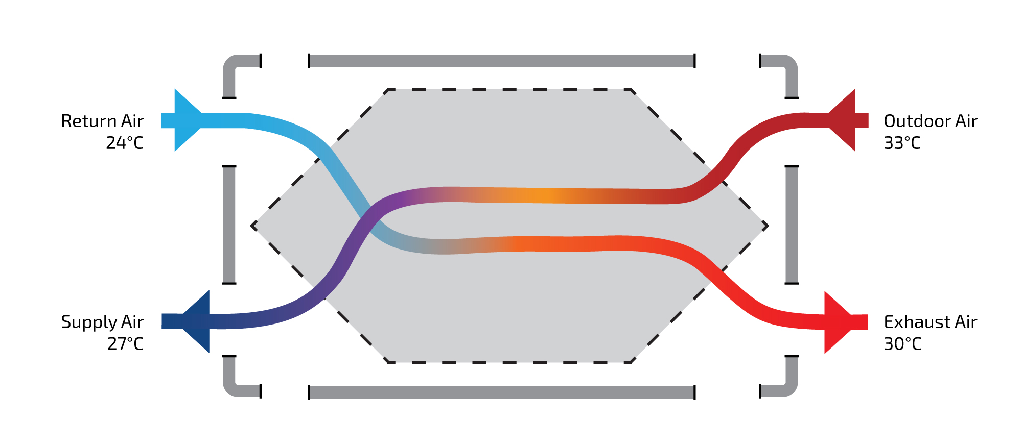 Giải pháp thông gió ERV hoạt động dựa trên nguyên lý trao đổi nhiệt và độ ẩm giữa hai luồng không khí riêng biệt là không khí mới từ bên ngoài và không khí thải từ bên trong nhà. Quá trình hoạt động của hệ thống ERV như sau: Tại trung tâm của hệ thống là một thiết bị gọi là bộ trao đổi nhiệt, bao gồm hai luồng không khí song song. Một luồng mang không khí trong lành từ bên ngoài vào, còn luồng kia đưa không khí ô nhiễm từ bên trong ra ngoài. Khi hai luồng không khí này di chuyển qua bộ trao đổi nhiệt, chúng sẽ trao đổi năng lượng nhiệt với nhau thông qua một màng lọc đặc biệt (được gọi là màng trao đổi nhiệt). Màng này có cấu trúc đặc biệt, hỗ trợ truyền nhiệt nhưng không cho phép không khí đi qua, đảm bảo hai luồng không khí không bị trộn lẫn với nhau. Trong quá trình trao đổi nhiệt, không khí thải ấm hơn sẽ truyền một phần nhiệt năng của nó cho luồng không khí mới lạnh hơn, làm nóng nó lên. Ngược lại, trong mùa hè, không khí thải mát hơn sẽ hấp thụ một phần nhiệt từ luồng không khí mới nóng hơn, làm mát nó. Quá trình này giúp giảm đáng kể nhu cầu sưởi ấm hoặc làm mát cho không khí mới, tiết kiệm năng lượng đáng kể.